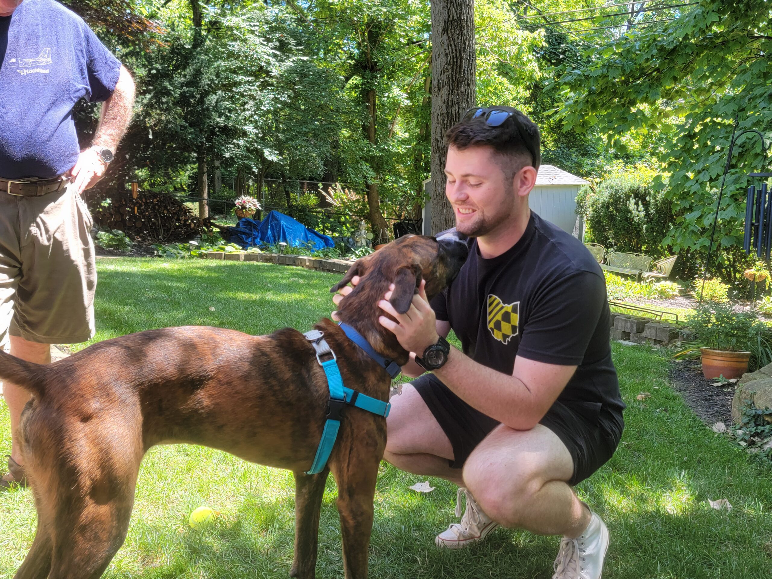 He has been deployed to Kuwait and Saudi Arabia. I’m a two-year-old, 63-pound boxer mix from Gigi’s. I’m a lively, snuggly, affectionate pup who loves to get the squeaker out of my toys! I was found as a stray by one of Gigi’s shelter partners in southern Ohio before I started on this journey.